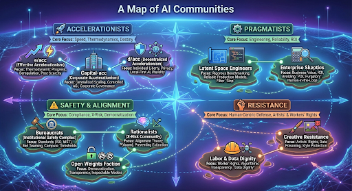It is easy to tune this out as noise. But these aren’t just internet fights. They are serious philosophical disagreements about the most powerful technology (potentially) humans have ever created. I began my search for AI communities expecting to find two simple ones: “Techno-Optimists” vs. “Doomers”. What I found was at least 10 different views of AI with their own goals and buzzwords. Here is an overview.
