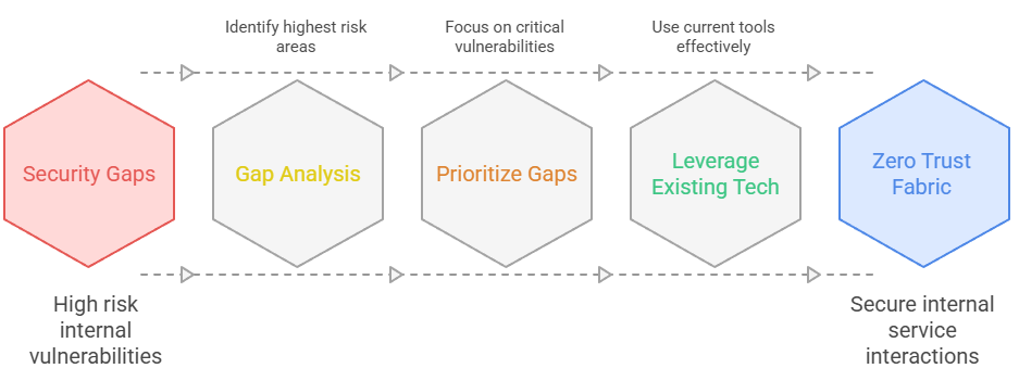 Before buying any new products, perform a gap analysis to find the areas of highest risk. Where are your components interacting with insufficient authentication? The most critical gaps are often not at the network edge, but deep inside your environment: a legacy application that trusts any connection from the local LAN, or a database that allows broad access to internal services. Prioritize these gaps and tackle the most critical one first. This iterative approach ensures that your limited resources are always focused on the most significant vulnerability.