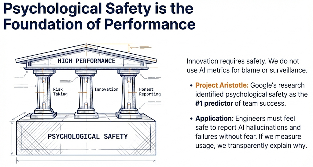 We must explicitly frame AI as a force multiplier, not a replacement. Our goal is to remove toil and augment human capability. If engineers fear that efficiency gains will lead to staff reductions, they will rationally resist using the tools. We are adopting AI to handle increasing workload complexity, not to reduce headcount.