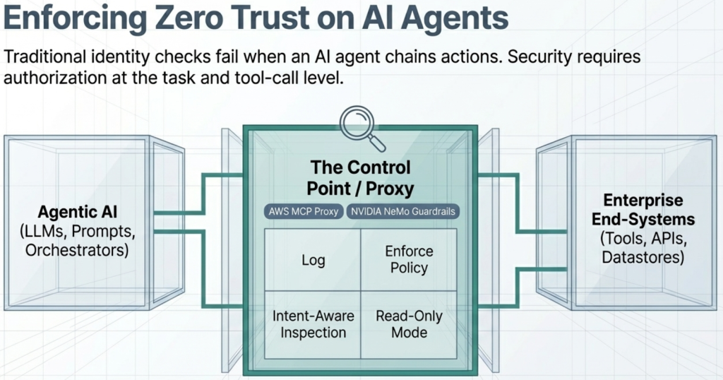 One emerging approach to keeping AI agents in line is to keep them from directly talking to anything. AWS has already released an MCP Proxy for AWS with features like logging and read-only mode. NVIDIA’s NeMo Guardrails offers a layer of programmable runtime controls. Vendors at RSAC demonstrated proxies for LLMs, MCPs, and tools. The theme is: put a control point in the middle, inspect requests and responses, enforce policy, and generate an audit trail.